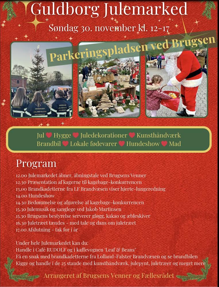 Kom og vær med – der er jul, hygge, juledekorationer, kunsthåndværk, lokale fødevarer, hundeshow, brandbil m. brand-cadetter og dans om juletræet, der tændes kl. 16.30.